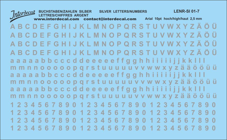 Buchstaben und Zahlen Arial 10 pt. Naßschiebebild Decal silber 106x55mm