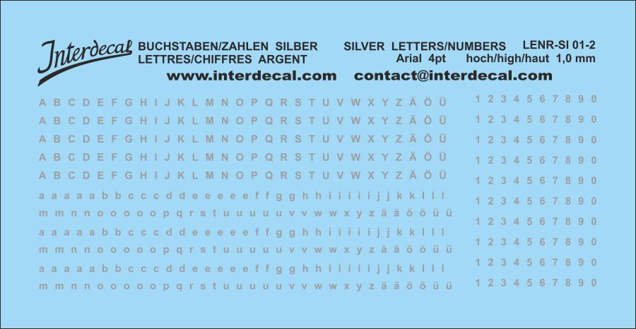 - Buchstaben und Zahlen Arial 3 pt. Naßschiebebild Decal silber 63x26mm
