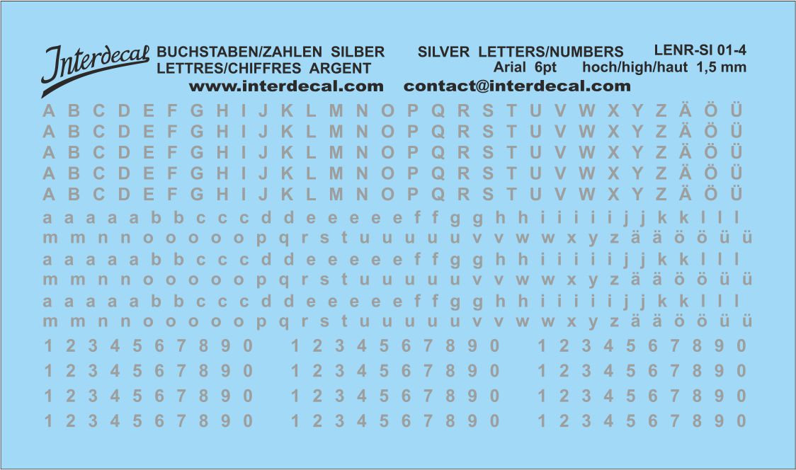 - Buchstaben und Zahlen Arial 7 pt. Naßschiebebild Decal silber 99x45mm