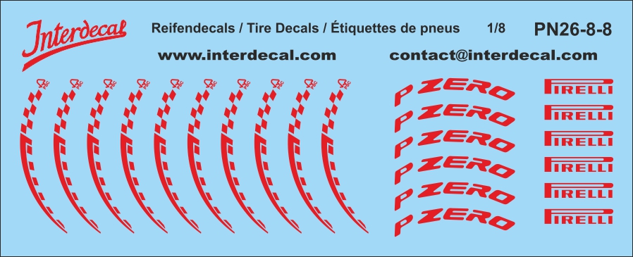 Reifenbeschriftungen 26-8 Pirelli Formel 1 1/8 Naßschiebebild Decal rot