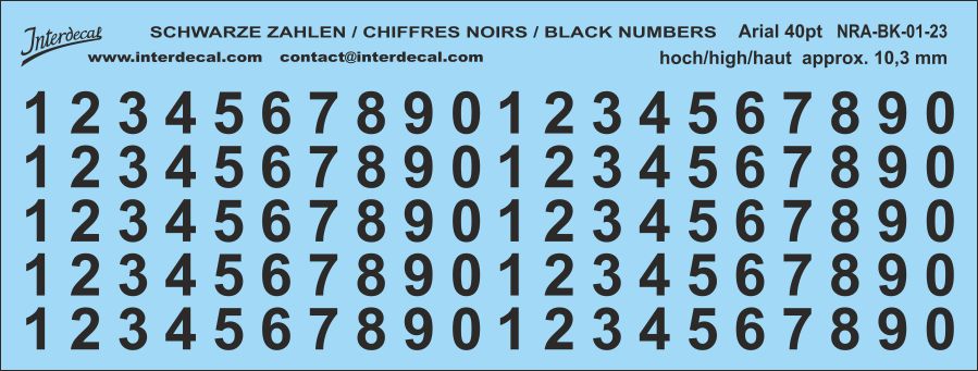 Zahlen Arial 26 46pt 10,3 mm hoch Naßschiebebild Decal schwarz 223x62mm