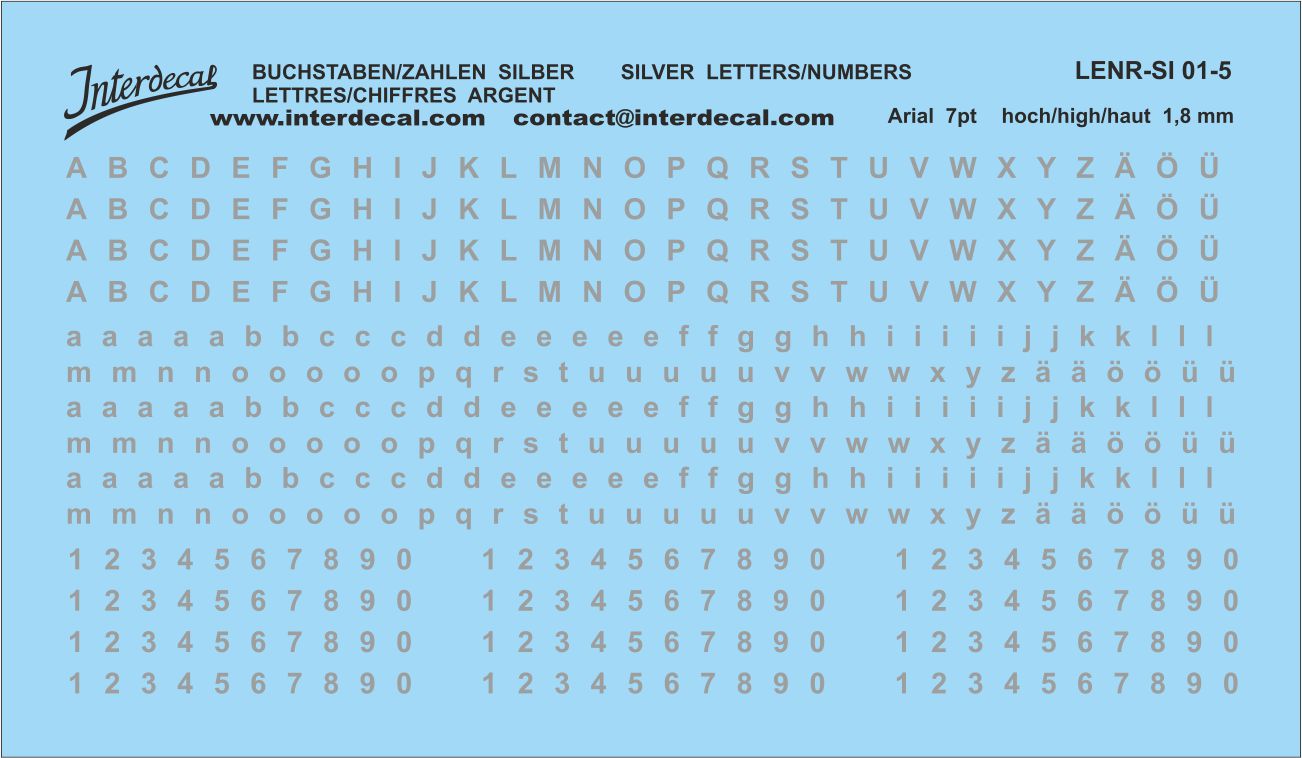 Letters and Numbers Arial 7 pt. Waterslidedecals silver 99x45mm INTERDECAL